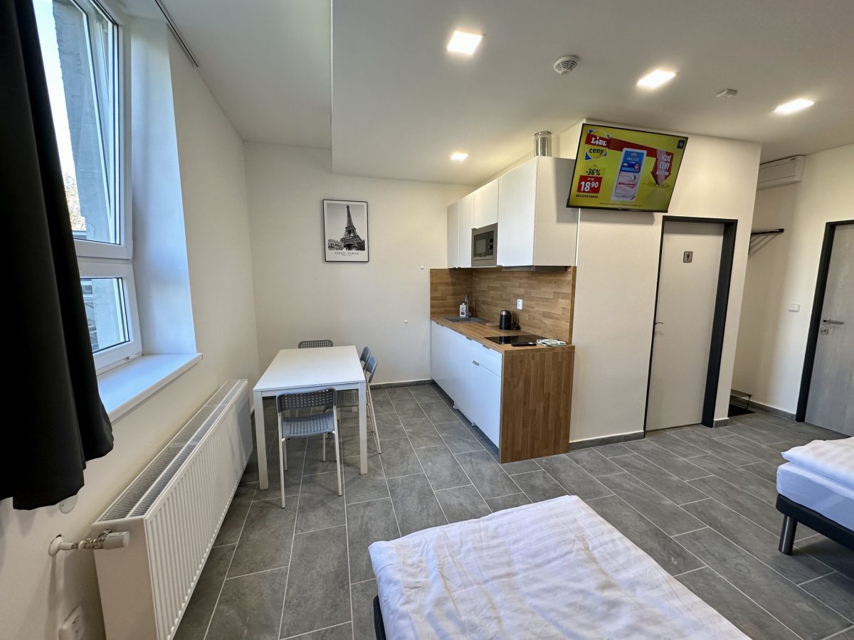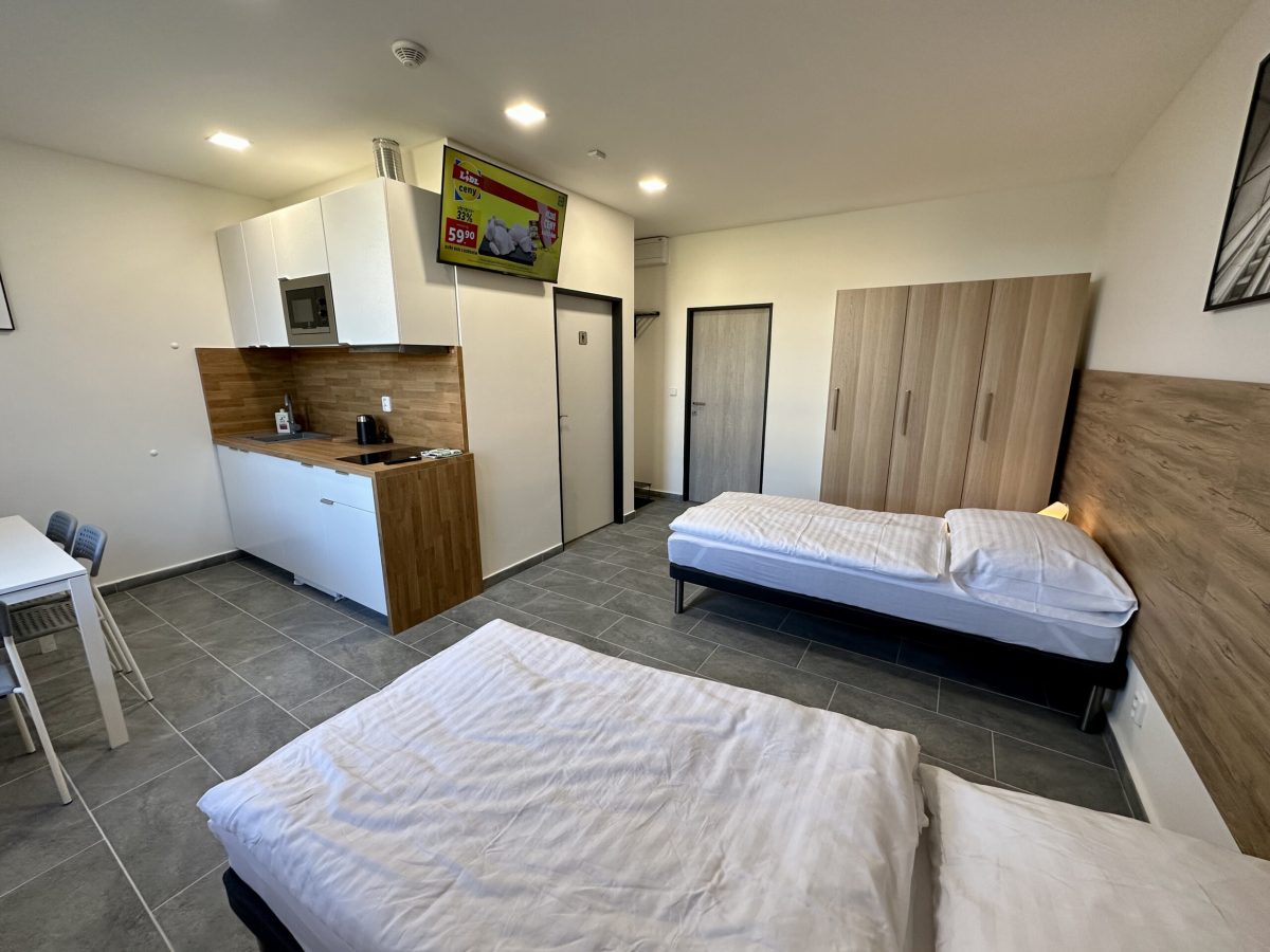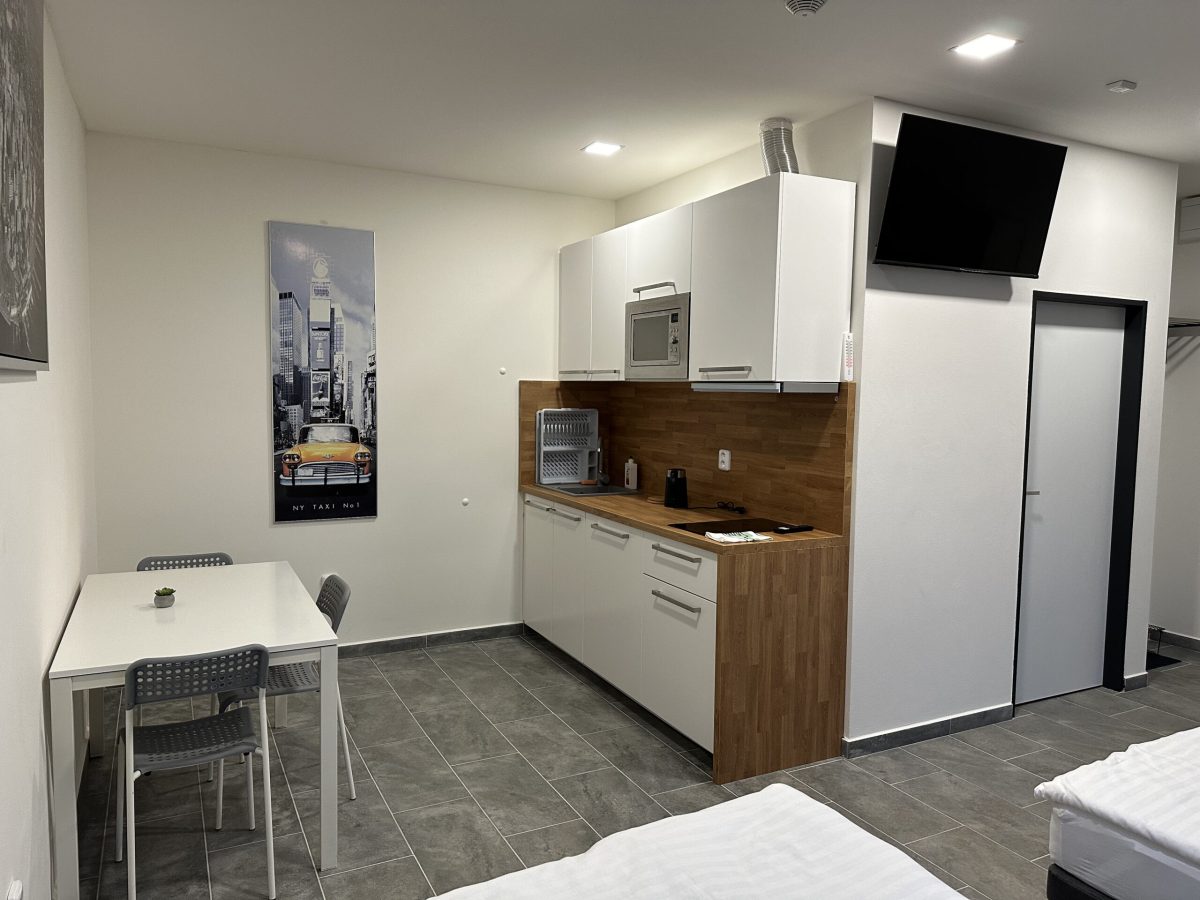 Kapacita ubytování je 25 apartmánových pokojů různých velikostí s vlastním plně vybaveným kuchyňským koutem a koupelnou se sprchou. Každý pokoj má LED televizi s 50-ti kanály. Wi-Fi připojení je samozřejmostí. Z dalšího vybavení můžeme nabídnout pračku se sušičkou ve společných prostorách. Žehlička je na vyžádání. Parkování zdarma přímo u hotelu pro naše hosty. V blízkosti se nachází autobusová i vlaková zastávka a mezinárodní letiště.